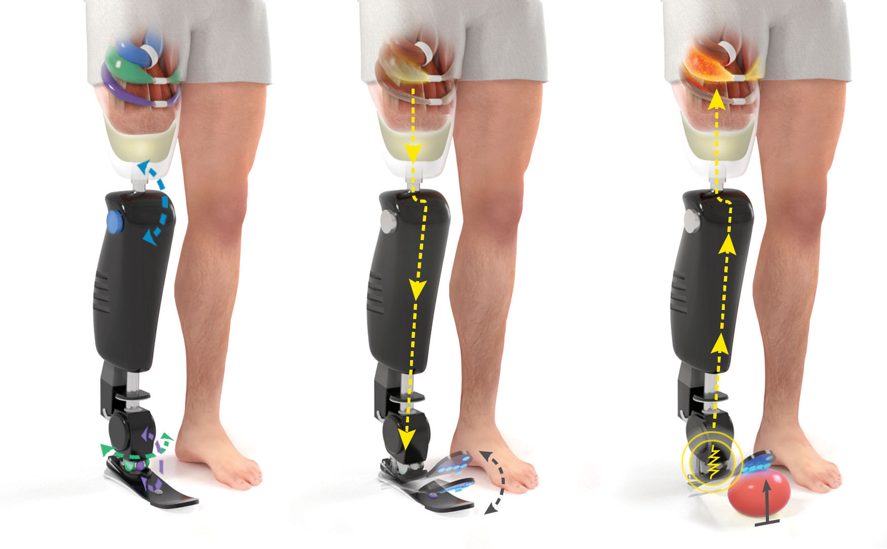 Preserving joint motion and sensation: The Agonist-Antagonist Myoneural Interface (AMI) is comprised of an agonist and antagonist muscle pair connected in such a way that contraction of the agonist muscle induces extension of the antagonist. For an aboveknee amputation, three AMIs are constructed for the knee (blue), subtalar (purple), and ankle (green) joints and positioned in the thigh.
