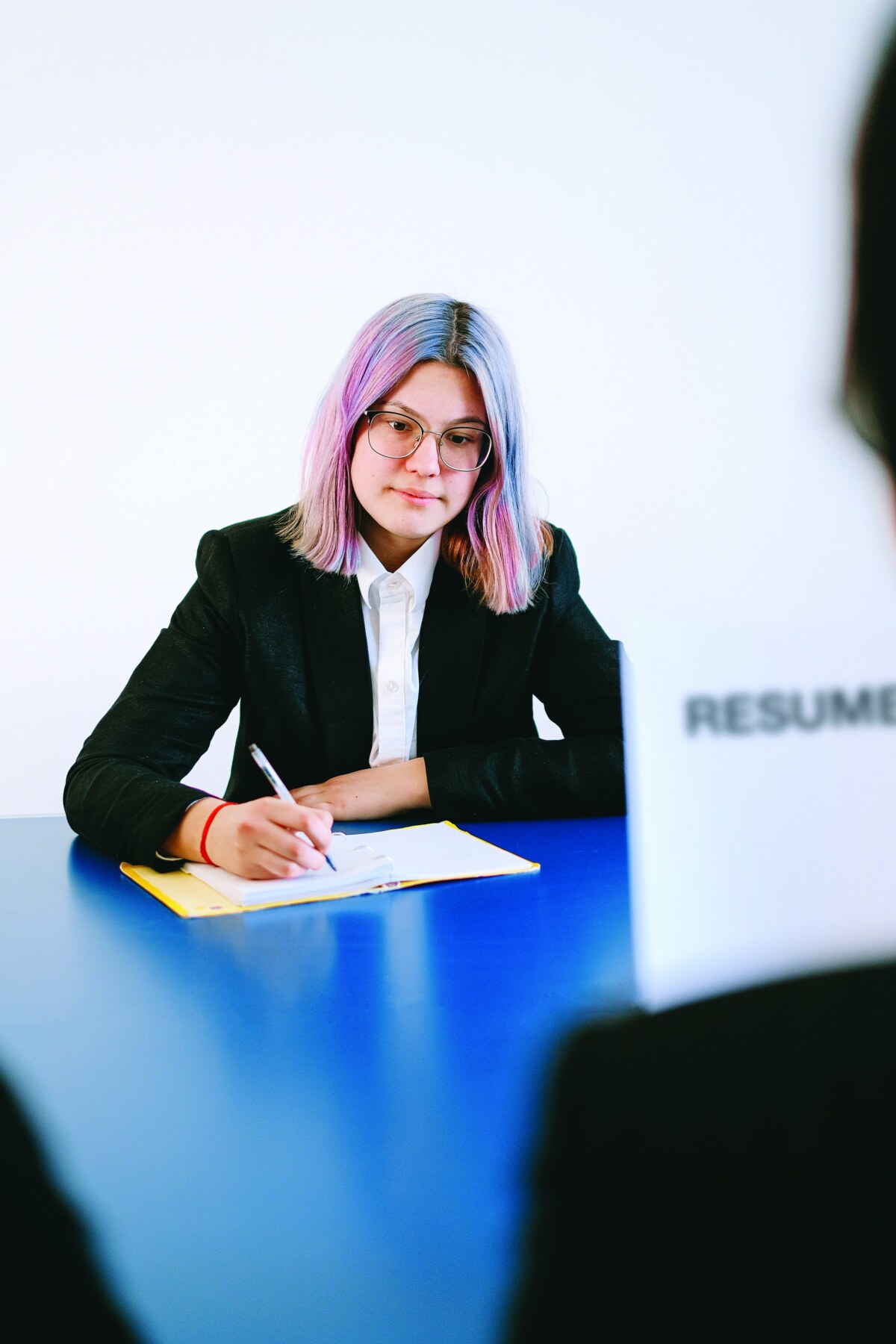 a woman sits across from two other women at a white table during a job interview.