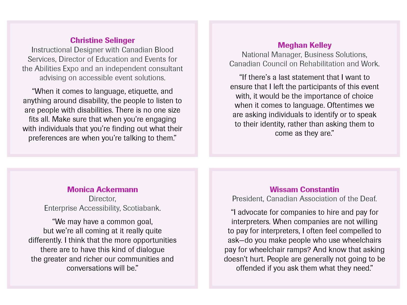 This also includes understanding the preference for person-first language, which puts an individual before their diagnosis, vs identity-first language, which is language that leads with a person’s disability, claims Christine Selinger. “I identify as a disabled person, specifically putting disabled first as I am a wheelchair user. To me, inclusive language across the board is both thoughtful and deliberate. I know language is difficult to change. Things will come out of your mouth before you realize what you’ve said—I’m definitely guilty of that! We’re not here today to tell you that what you’re doing is wrong or that you’re a bad person if you use certain language. We’re simply here to provide awareness of the impacts of language.”